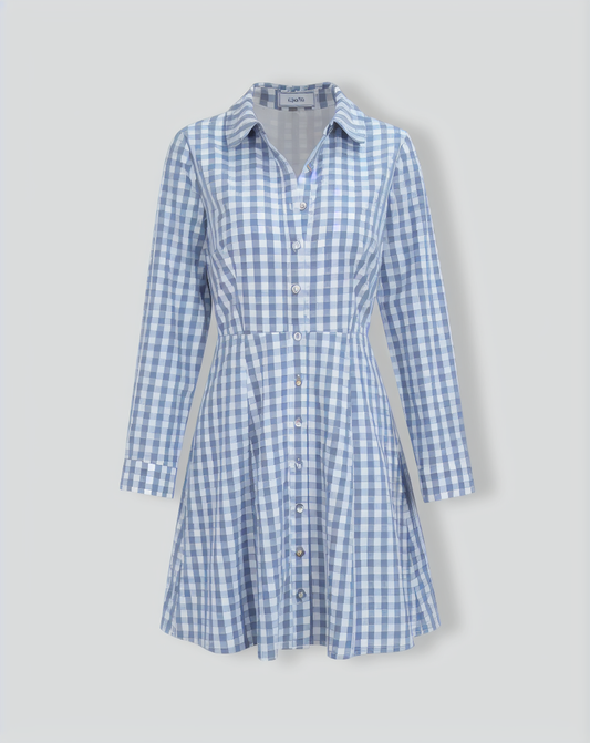 Women's Blue Plaid Lapel Cotton Mini Dress