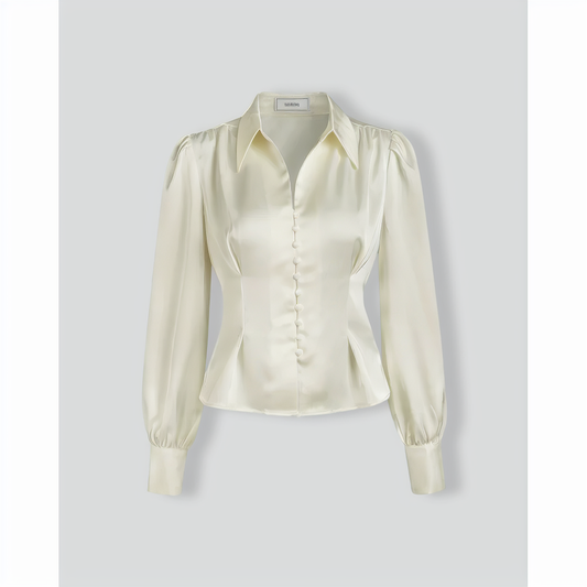 The Solid Collared Puff Sleeve Satin Blouse