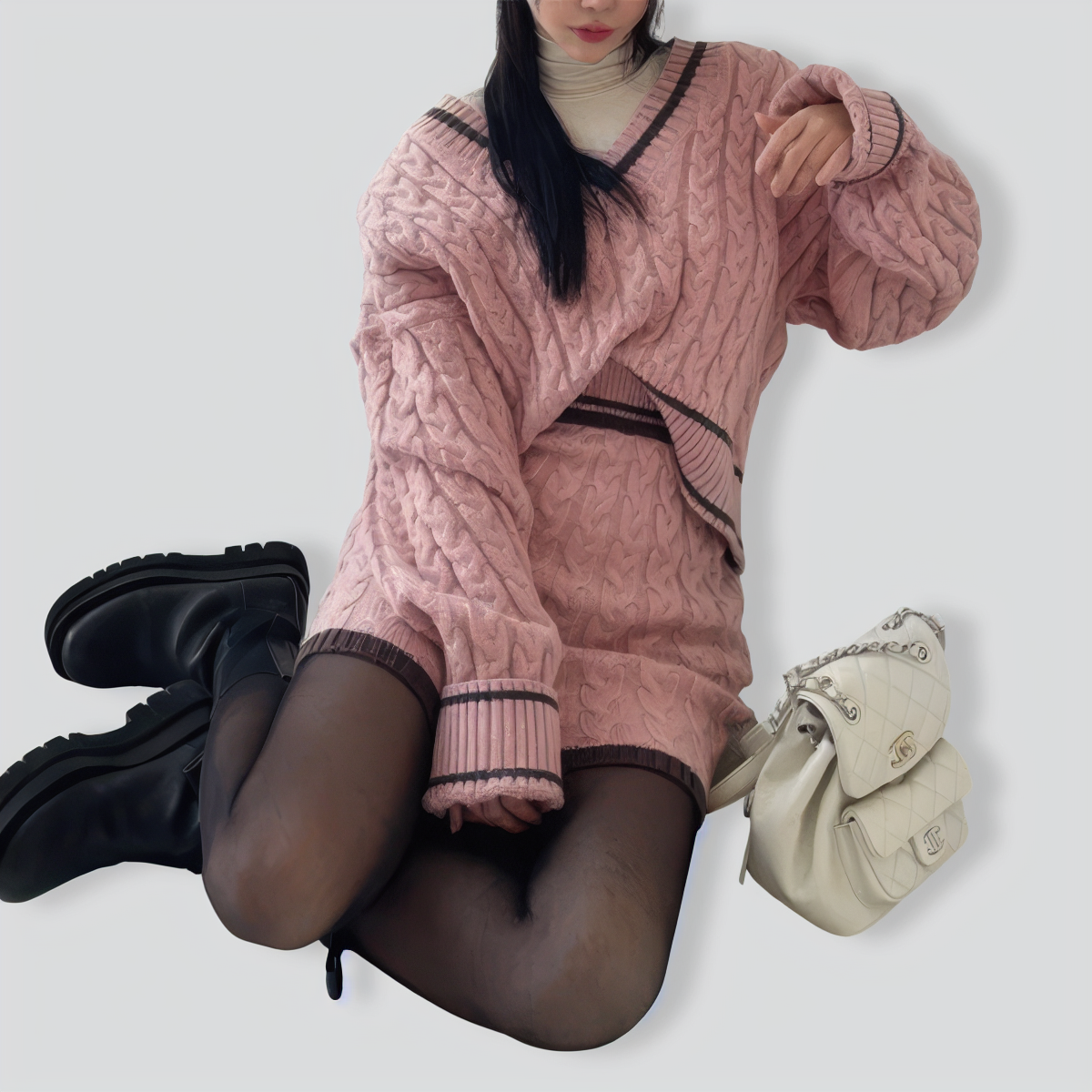 Retro V-neck contrasting hemp pattern two-piece set